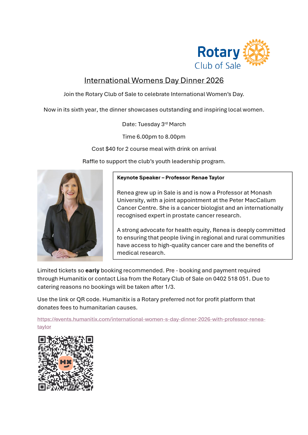 Our International Women’s Day event is back for its sixth year, and I am excited to announce that our speaker is Professor Renea Taylor. Renae, a Sale local, is a Professor at Monash University, with a joint appointment at the Peter MacCallum Cancer Centre. She is a cancer biologist and an internationally recognised expert in prostate cancer research. A strong advocate for health equity, Renea is deeply committed to ensuring that people living in regional and rural communities have access to high-quality cancer care and the benefits of medical research. She should be an interesting and inspiring speaker.